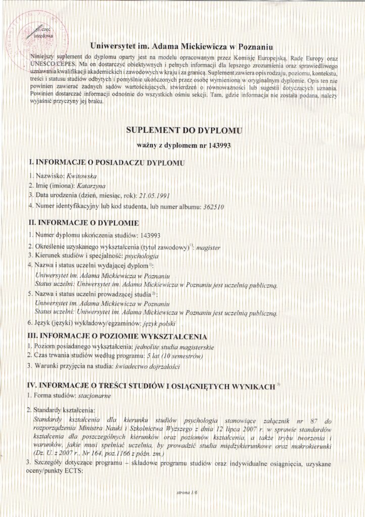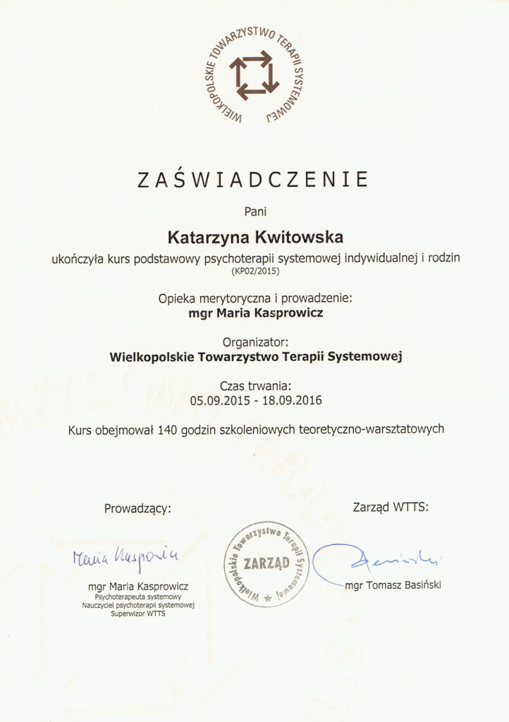 Jestem dyplomowanym psychologiem oraz psychoterapeutą w trakcie certyfikacji, a także członkiem Wielkopolskiego Towarzystwa Terapii Systemowej (WTTS). W mojej pracy terapeutycznej odwołuję się do podejścia systemowego oraz narracyjnego. W trosce o najwyższy standard świadczonych usług swoje działania poddaję regularnej superwizji, a także dbam o swój rozwój zawodowy poprzez uczestnictwo w szkoleniach, warsztatach i kursach.